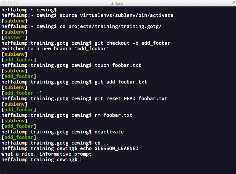The command line is your home as a developer. You must be comfortable there. In order to improve your comfort there are a number of enhancements you can make to improve your experience, especially with non-standard software like git and virtualenv